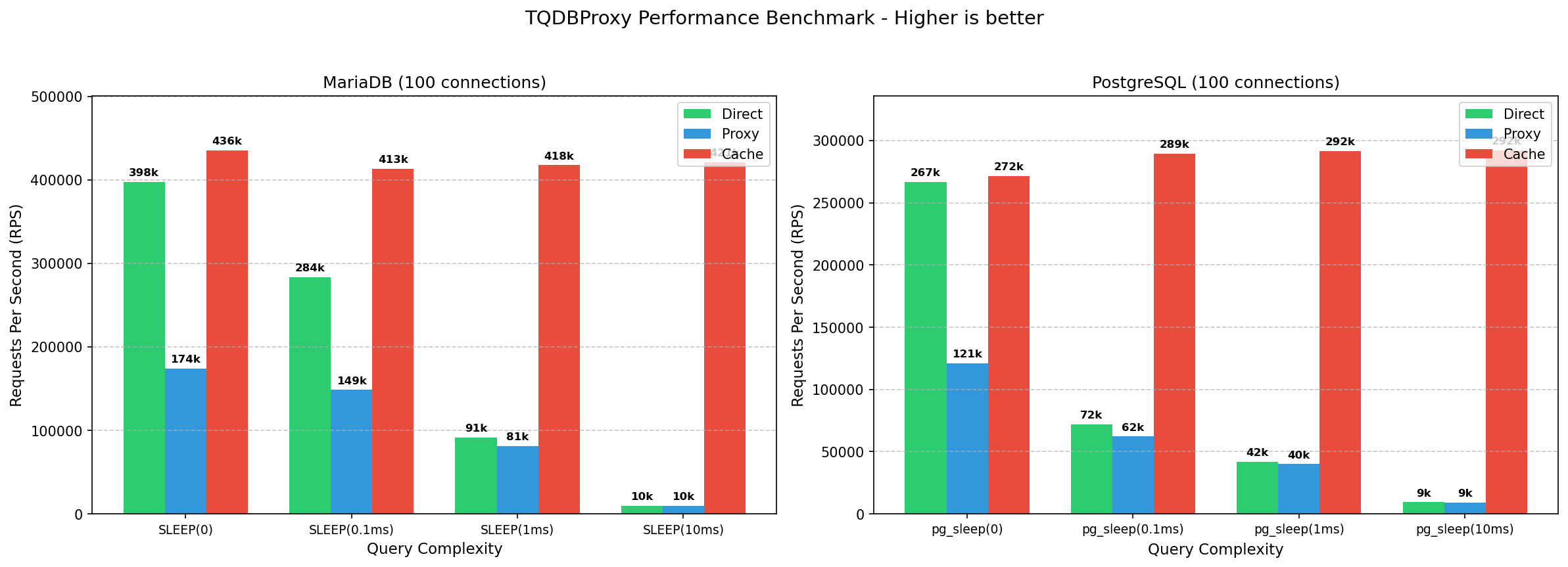 The proxy adds significant overhead for trivial queries. It is more than 50% slower for sub-millisecond operations. MariaDB drops from 398K to 174K RPS, and PostgreSQL from 267K to 121K RPS when running through the proxy instead of direct connections.